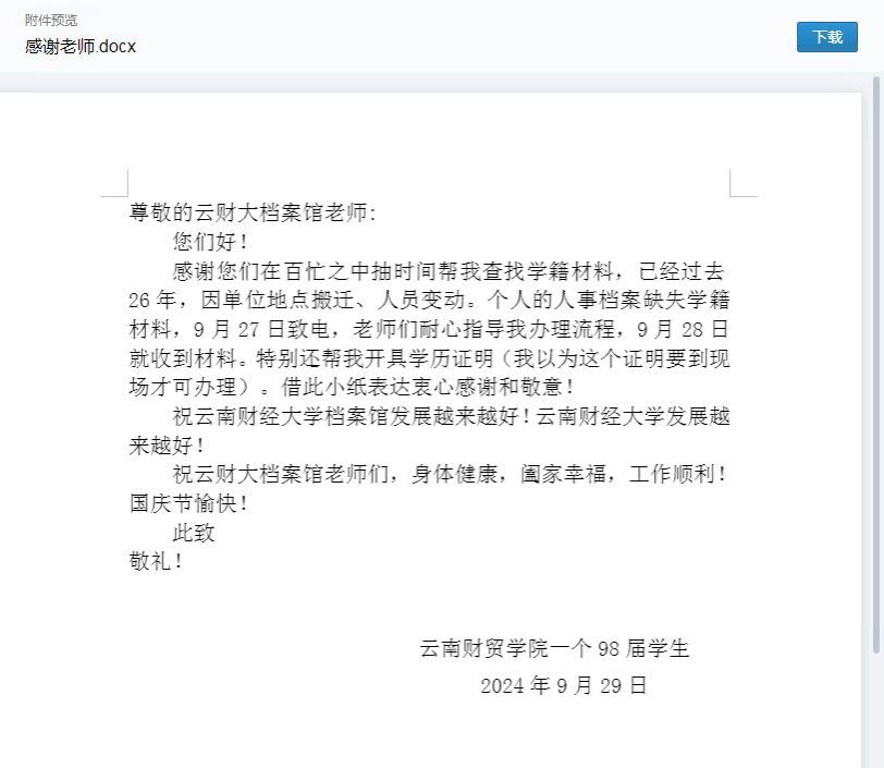 “感谢你们在百忙之中抽时间帮我查找学籍材料,已经过去26年,因单位地点搬迁、人员变动。个人的人事档案缺失学籍材料,9月27日致电,老师们耐心指导我办理流程,9月28日就收到材料。特别还帮我开具学历证明(我以为这个证明要到现场才可办理)。借此小纸表达衷心感谢和敬意!”詹同学这封150余字的感谢信,是档案馆用心用情为广大师生校友做好档案查阅服务的小小缩影。