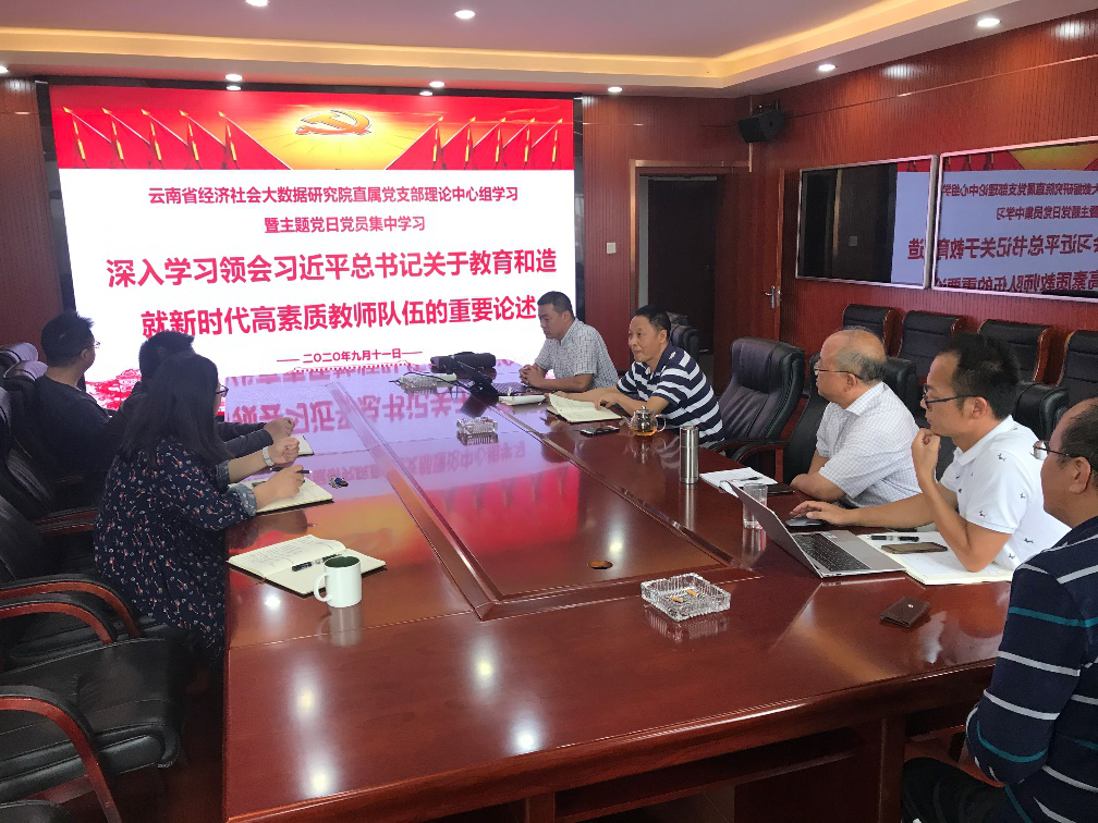 2020年9月11日下午,云南省经济社会大数据研究院直属党支部理论学习中心组第三次集体学习,深入学习领会习近平总书记关于教育和造就新时代高素质教师队伍的重要论述。直属党支部书记余建坤主持本次学习,直属党支部全体党员同步参加本次学习活动。