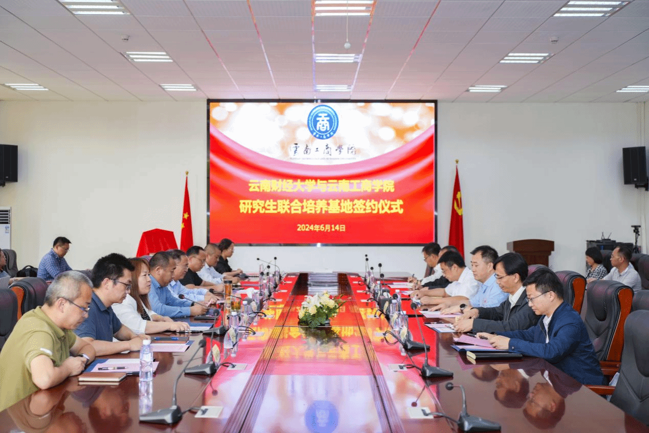 6月14日,十大买球官方网站党委委员、副校长余怒涛带队赴云南工商学院开展研究生联合培养座谈交流。双方签订了共建研究生联合培养基地协议并举行基地揭牌仪式。云南工商学院执行董事长姬其佐、校长蒋永文、副校长马晓红参加座谈交流和签约揭牌仪式。