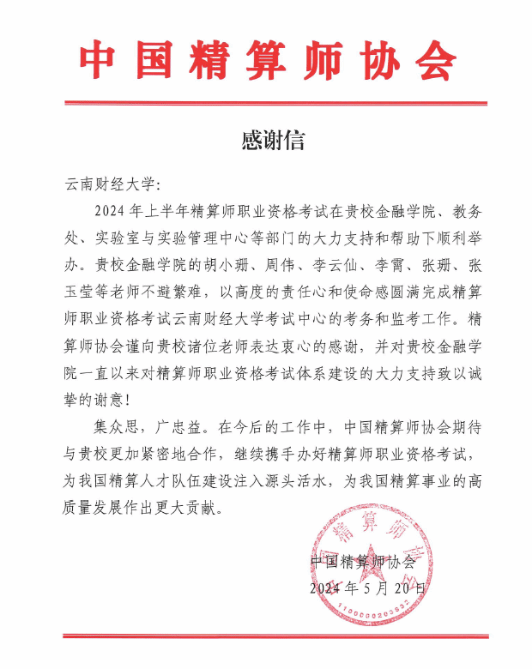近日,中国精算师协会向买球发来感谢信,对买球金融学院、教务处、实验室与实验教学管理中心等部门协作举办的2024年上半年精算师职业资格考试工作给予肯定并表示感谢。来信表示:“贵校金融学院的胡小珊、周伟、李云仙、李霄、张珊、张玉莹等老师不避繁难,以高度的责任心和使命感圆满完成精算师职业资格考试十大买球官方网站考试中心的考务和监考工作。精算师协会谨向贵校诸位老师表达衷心的感谢,并对贵校金融学院一直以来对精算师职业资格考试体系建设的大力支持致以诚挚的谢意”。