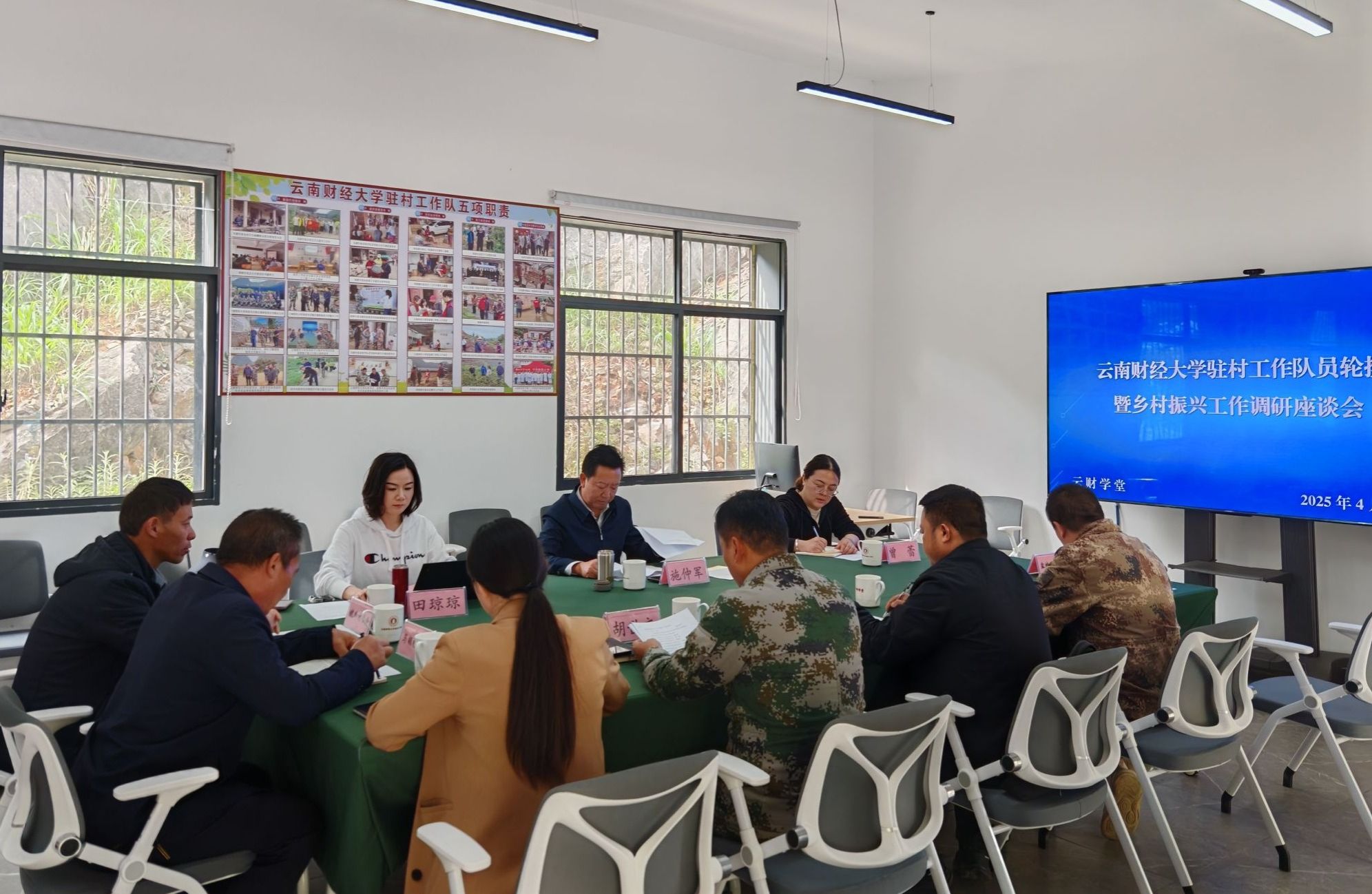 学校驻村工作队长胡世文结合驻村工作五项职责清单,对驻村工作进行了全面汇报。坡脚镇党委副书记、镇长王应龙围绕2025年恳请帮扶事项作说明。