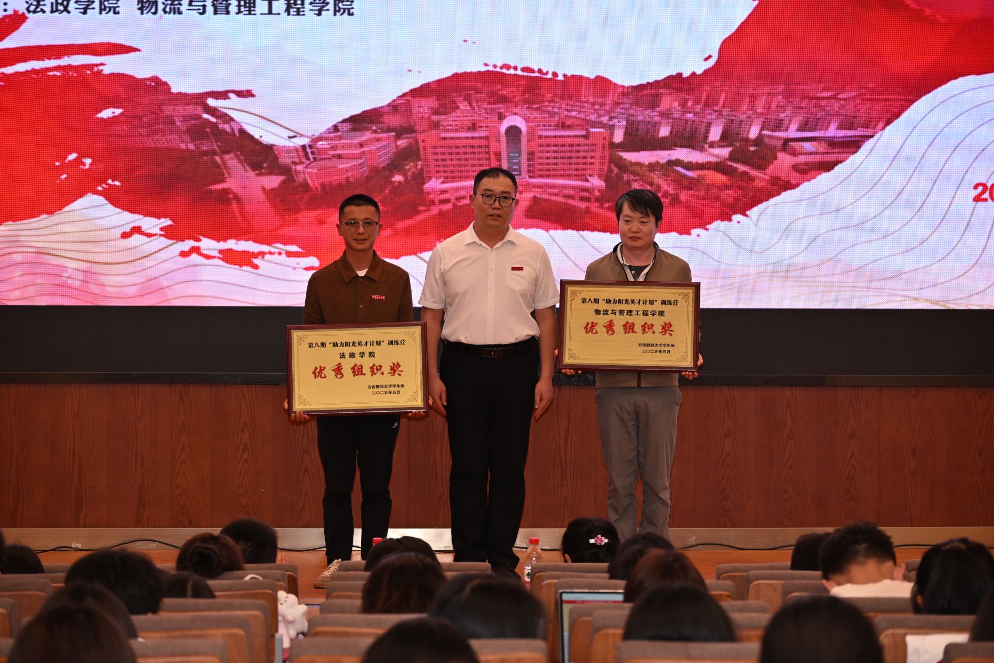学生处副处长、学生工作部(武装部)副部长王帅宣读“助力阳光英才计划”训练营优秀学员名单,并为“优秀组织单位”授牌。法政学院党委副书记兼纪委书记张吟竹、物流与管理工程学院党委副书记兼纪委书记杨缅为优秀营员代表颁发证书。