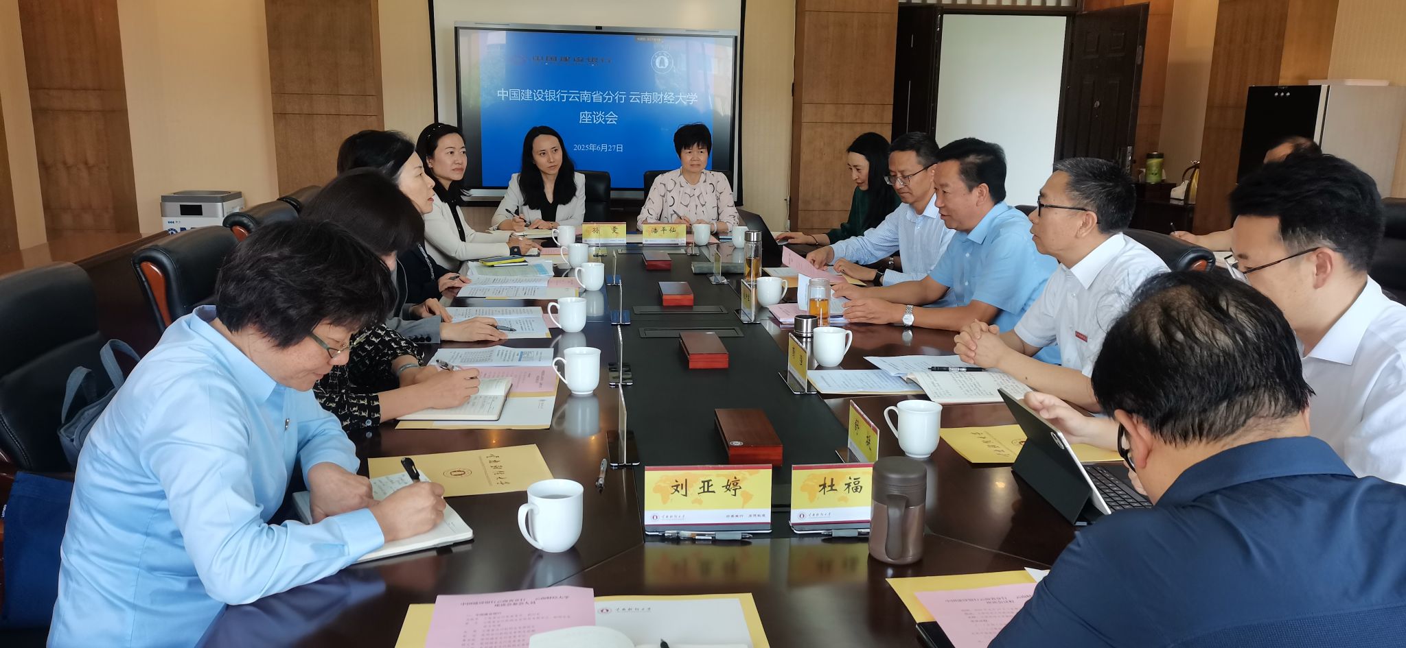 马晓芫介绍了建行各项业务发展情况,她表示,建行云南省分行将持续做好对学校的信贷支持,做好对学校师生的精细化服务,加强在超长期国债等金融和债务政策上的对接服务,希望双方在产学研融合发展、学生实习实践、校友综合服务、特色金融文化研究等方面加强合作。她同时表达了与学校共同开启面向“十五五”期间战略合作的愿景。