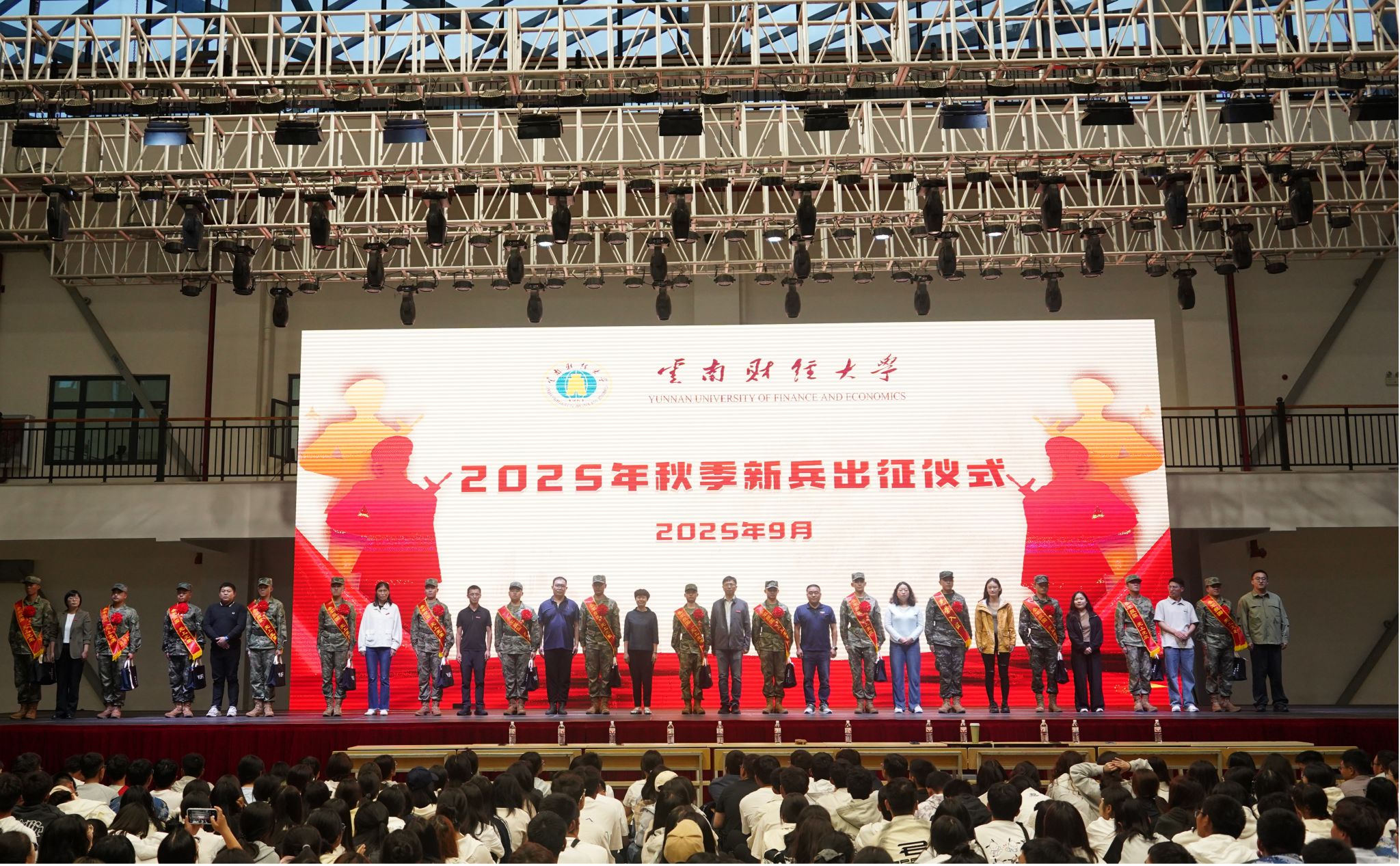 9月14日晚,十大买球官方网站2025年秋季新兵出征仪式在安宁校区体育馆举行,新兵家长、学校武装部、新兵所在学院负责人、辅导员以及强军社学生和安宁校区2025级全体新生共同为即将奔赴军营的15名优秀学子送行。