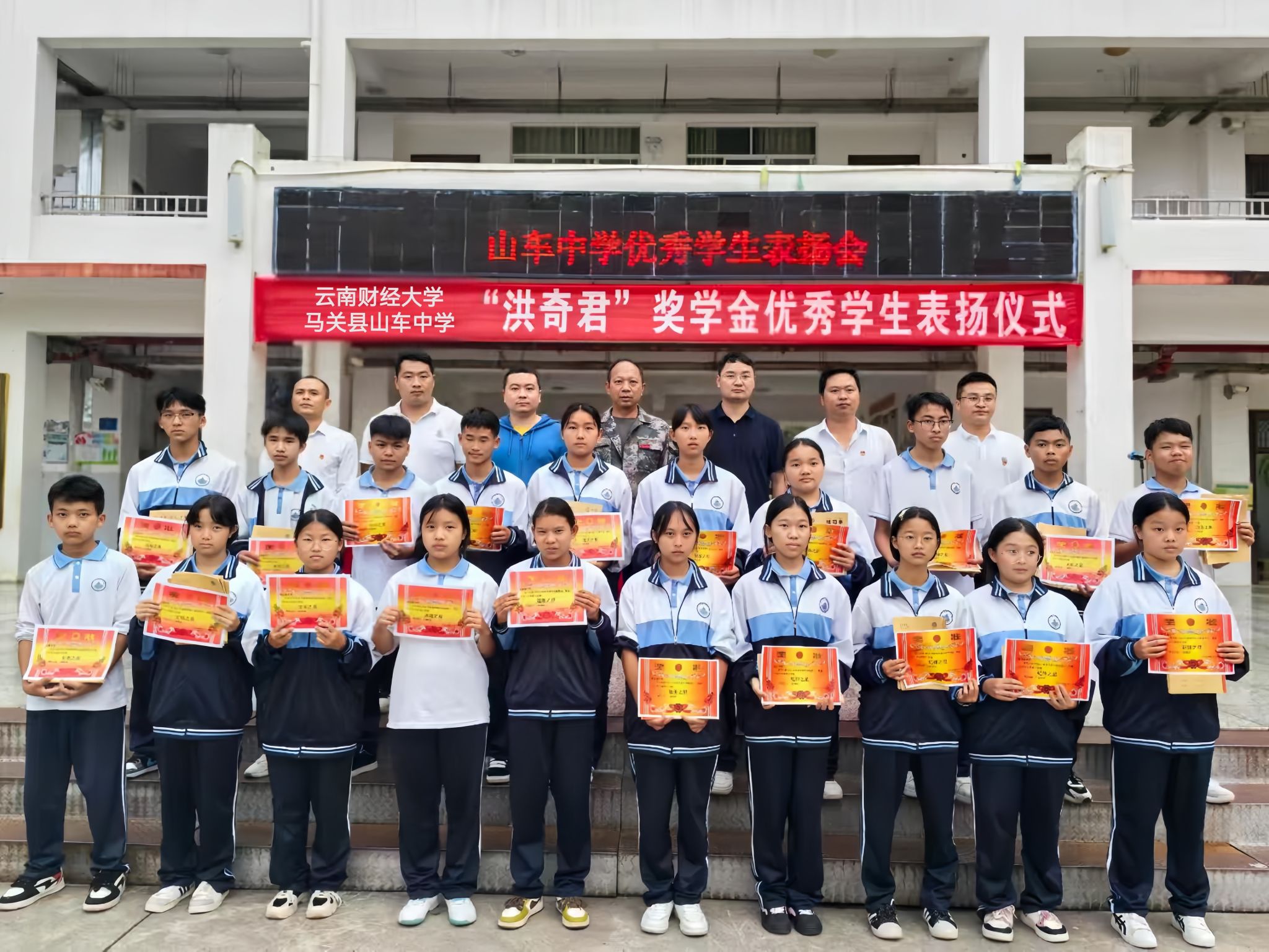 山车中学教务副主任陈卫琼宣读了《马关县山车中学“洪奇君奖学金”管理办法》及获表彰学生名单。荣获一等奖、二等奖、三等奖以及单科第一、进步奖、四星奖的同学依次上台领奖。