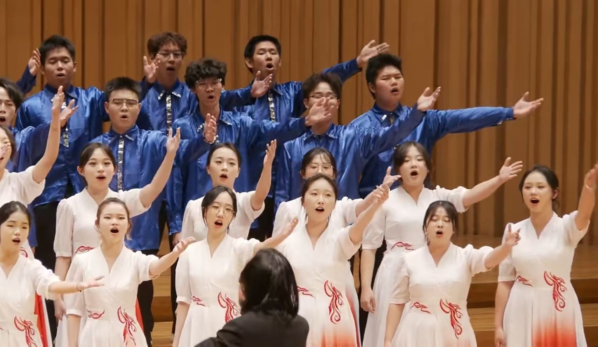 合唱团在学校艺术教育中心主任、校艺术团指导教师杨波的指挥下,深情演绎了《再别康桥》与《海阔天空》两首曲目,展现了良好的艺术素养和精神风貌。