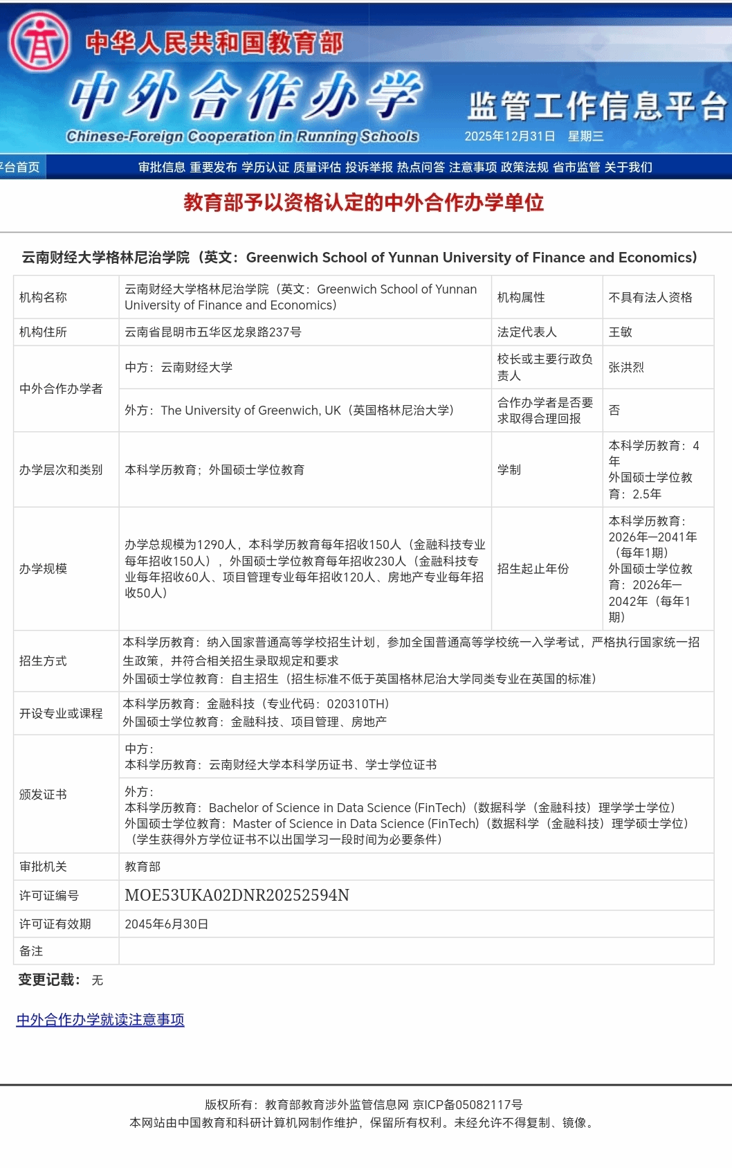 12月31日,教育部中外合作办学监管工作信息平台公布了教育部予以资格认定的中外合作办学单位。十大买球官方网站与英国格林尼治大学合作举办的“十大买球官方网站格林尼治学院”获批成立,成为十大买球官方网站首个中外合作办学机构,标志着学校的中外合作办学实现了从项目到机构的跨越,实现了办学层次、办学规模、招生自主权与国际影响力的多维跃升,为区域高等教育对外开放提供了更加有力的支撑。