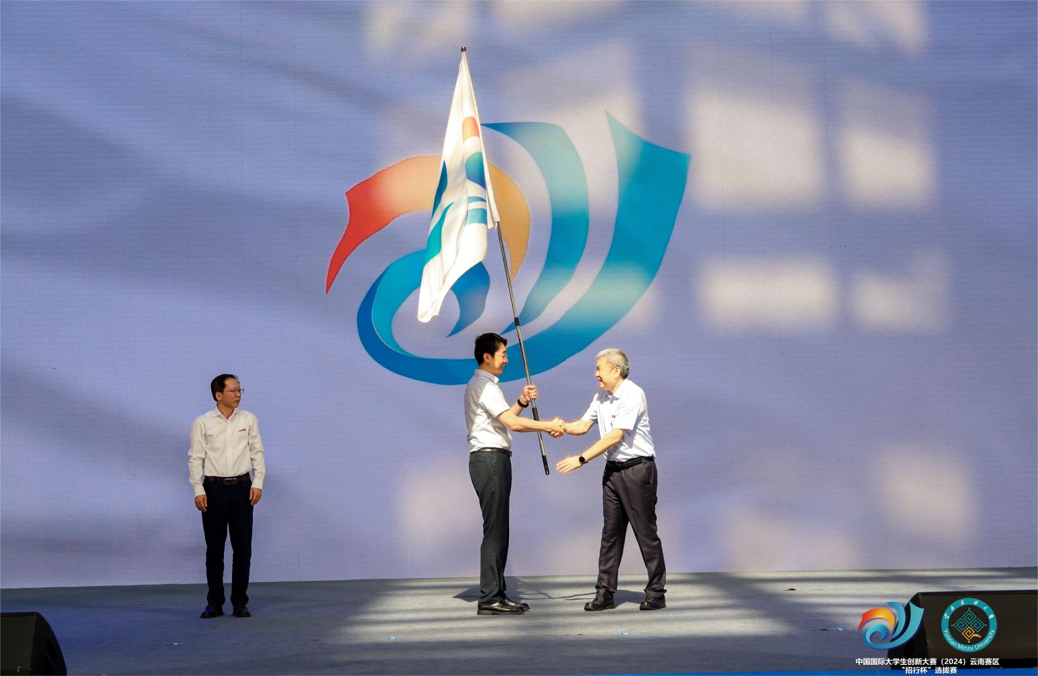 7月19日,中国国际大学生创新大赛(2024)云南赛区冠军争夺赛暨闭幕式在云南民族大学举行。闭幕式上举行了会旗交接仪式,十大买球官方网站党委副书记、校长王敏代表学校接旗,中国国际大学生创新大赛(2025)云南赛区比赛将由十大买球官方网站承办。
