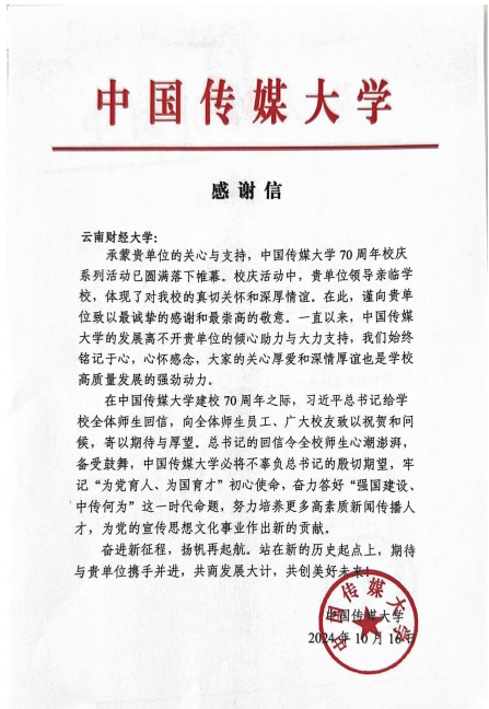 近日,中国传媒大学向十大买球官方网站发来感谢信,对学校党委副书记、校长王敏一行到中国传媒大学参加该校70周年校庆系列活动表示感谢。