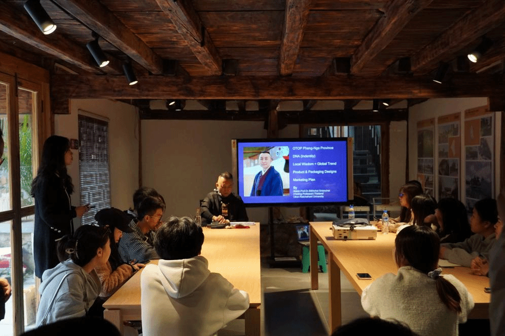 启动仪式后,泰国乌汶叻差他尼大学应用艺术与建筑学院Sitthichai SMANCHAT教授举办设计思维拓展讲座,详细介绍了泰国OTOP(一村一品)手工艺品发展模式。他将具体案例和理论相结合,以泰国攀牙省作为样本,从“DNA”“本土智慧+全球趋势”“产品与包装设计”“营销计划”四个层面,以及“产品筛选”“产品检测”“产品改进”五个流程分享了泰国“一村一品”的发展模式及借鉴经验。