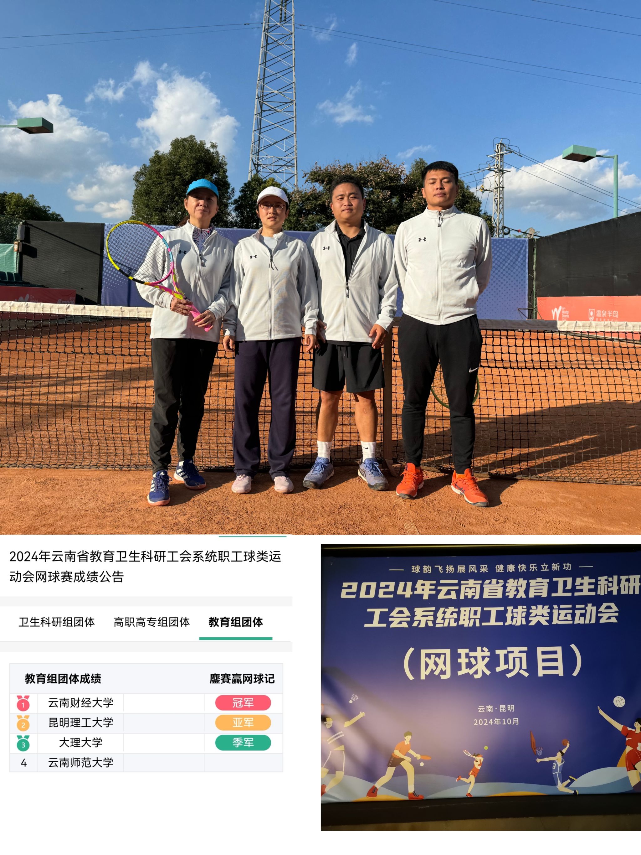 11月4日,云南省教卫科工会系统职工球类运动会在昆明冶金高等专科学校落下帷幕。买球代表队在此次比赛中表现优异,网球队荣获混合团体赛冠军,男、女气排球队荣获季军。