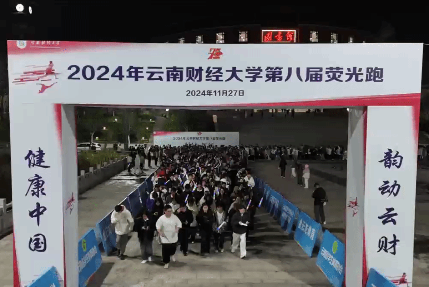 为进一步推进健康中国建设和《“健康中国2030”规划纲要》的实施,11月28日晚,第八届校园荧光夜跑活动在龙泉路校区和安宁校区同时举行,两个校区共计11500余名学子参与活动。财大学子用点点荧光照亮冬日的夜晚,以青春之姿跑出云财加速度。