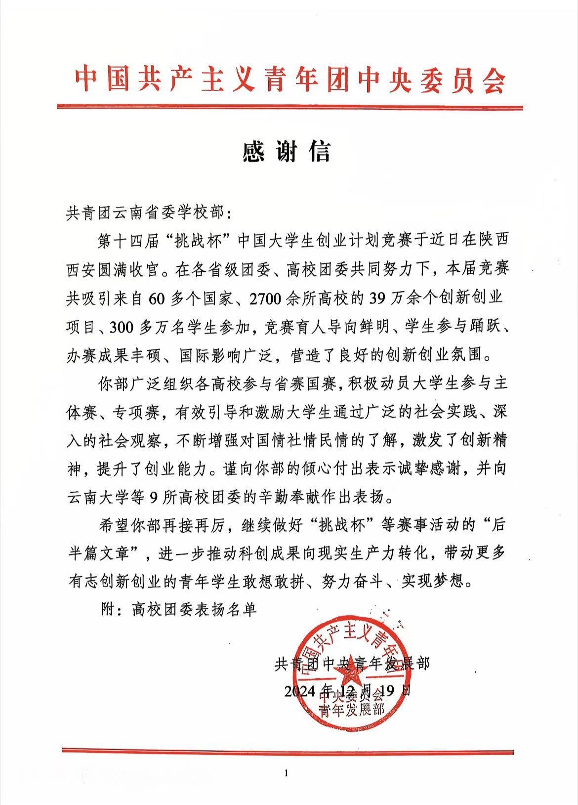 近日,共青团中央青年发展部对在第十四届“挑战杯”中国大学生创业计划竞赛组织发动工作中表现突出的省份团委和高校团委致信表扬。全国共有2700余所高校组织参加“挑战杯”竞赛,其中云南省9所高校团委被表彰,十大买球官方网站位列其中。