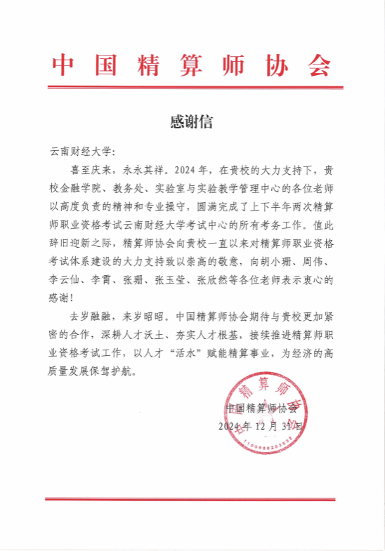 近日,中国精算师协会向买球发来感谢信,对买球金融学院、教务处、实验室与实验教学管理中心等部门协作举办的2024年全国精算师职业资格考试工作给予肯定并表示感谢,其中特别向胡小珊、周伟、李云仙、李霄、张珊、张玉莹、张欣然等参与具体工作的老师表达了谢意。