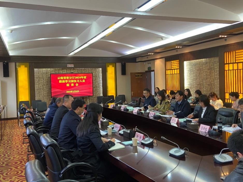 3月4日上午,校党委委员、副校长余怒涛率队赴省审计厅参加2024年度跟班学习和实习人员座谈会。云南省审计厅党组成员、副厅长张勇,机关党委(人事处)处长刘靖,计算机中心主任何莉,科培中心主任念胜林,办公室副主任张钧理,机关党委(人事处)副处长江磊等相关领导和部门负责人,以及全体2024年度跟班学习和实习人员参加座谈。