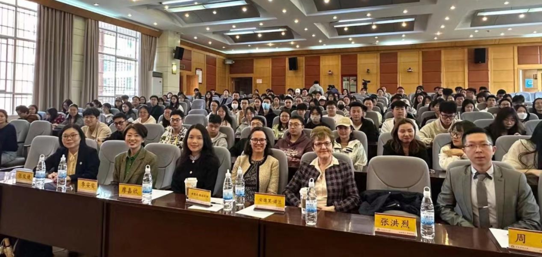 访问团在校期间举行了师生见面会。安德里·诺兰和娜奥米·格拉汉姆对同学表示欢迎,希望同学们努力完成学业、锻炼自我,记住自己的另一个母校是英国爱丁堡龙比亚大学。周帆、廖嘉欣和李安安三名教师给同学们分享了到龙比亚大学学习的方式和政策,鼓励大家赴英国继续深造。