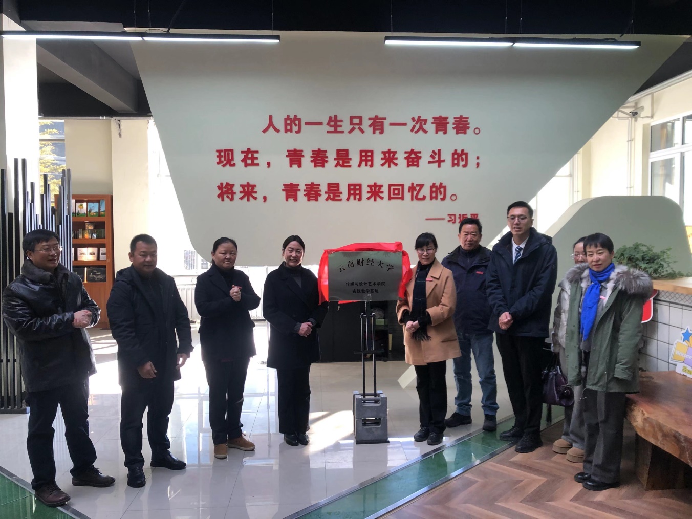 随后,调研组一行来到迪庆州青年创业就业指导中心,考察迪庆青年创业兴乡工作,参观青创企业产品展区。迪庆团州委书记唐浚泷介绍创业项目孵化有关工作情况。王建颖和迪庆州副州长余桂芬共同为“传媒与设计艺术学院实践教学基地”揭牌。