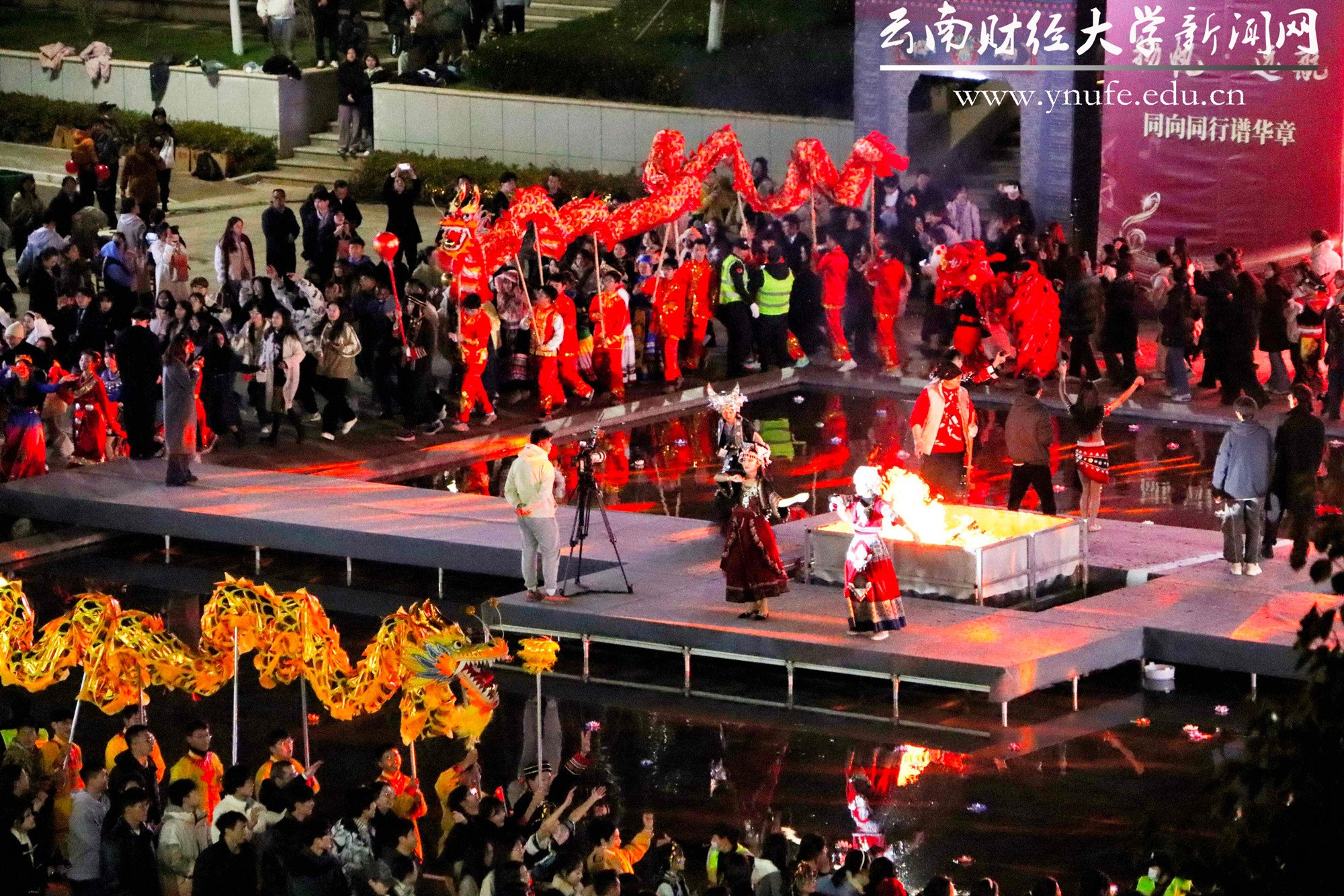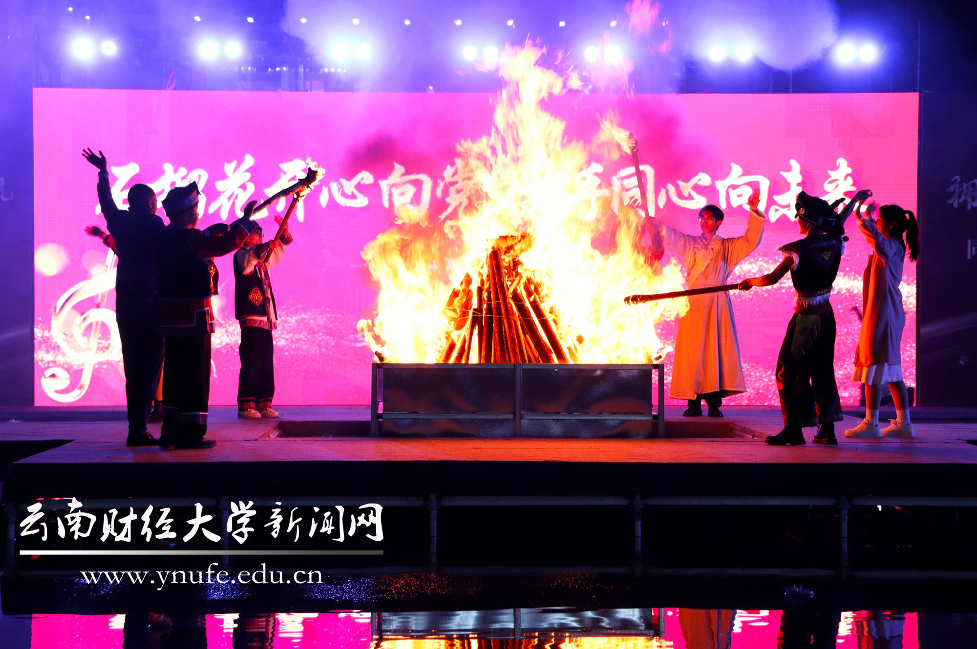 音乐会后,由十大买球官方网站各族学生和留学生代表、迪庆州民族代表共同点燃的篝火拉开了“篝火民族大联欢”的序幕,全体嘉宾和师生围绕篝火载歌载舞,迎接新年的到来。