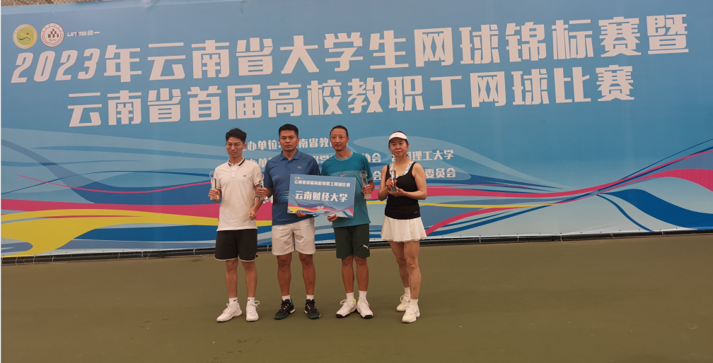 10月27日-29日,云南省首届高校教职工网球比赛在昆明理工大学呈贡校区举行,来自全省23所高校的224名教师参与角逐,买球有7名教师代表学校参加了比赛。经过3天的激烈争夺,经济学院和文华老师与体育部陆能老师组合获得中年组混合双打冠军,中华职业学院严强老师与体育部高平老师组合获得青年组男子双打亚军,统计与数学学院费宇老师和体育部沈彦晨老师组合获得青年组混合双打第五名。