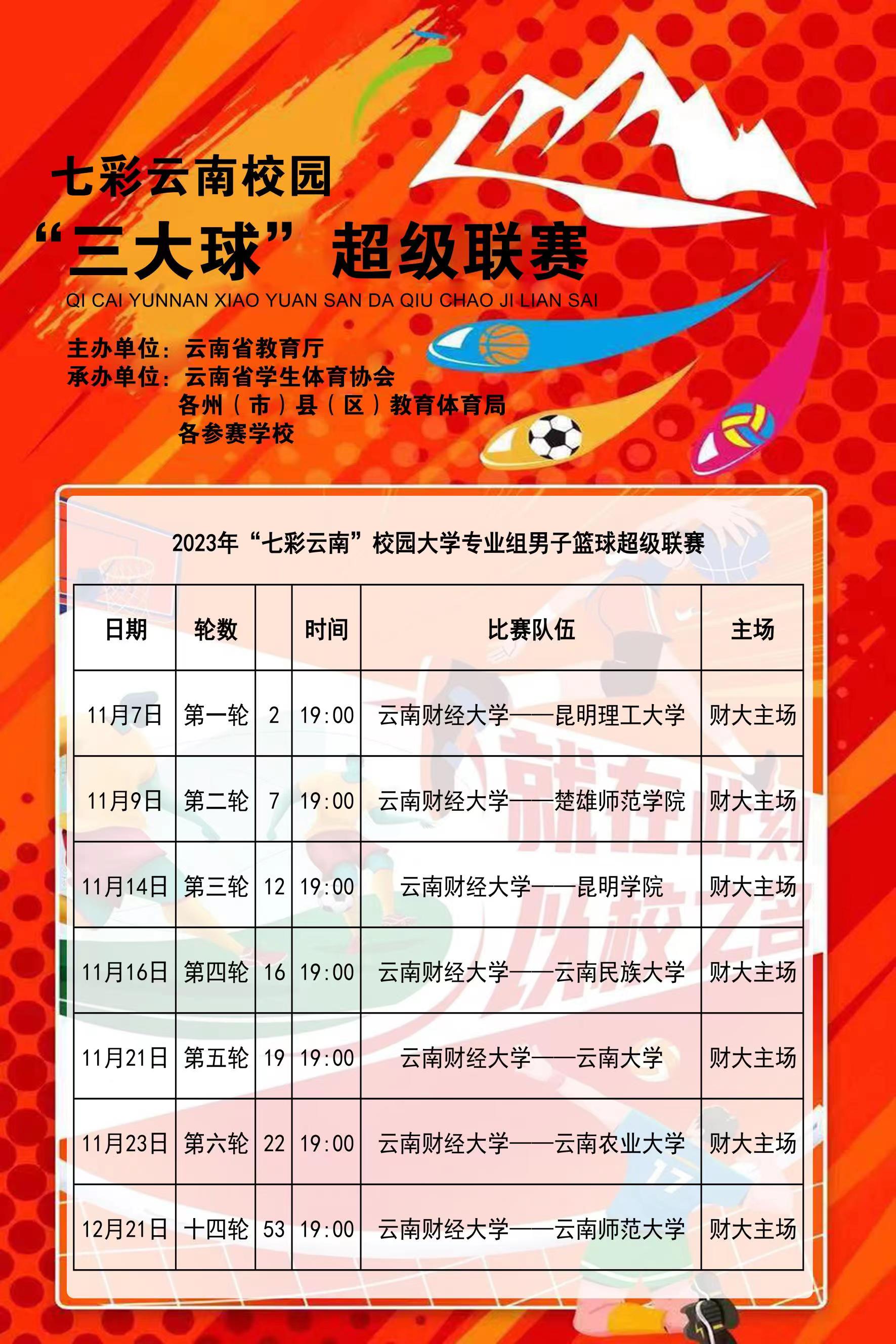 七彩云南校园“三大球”超级联赛创新推出主客场赛制,经学校申报、组织专家实地考察,最终确定72支“三大球”运动队参赛,设大学男子篮球项目、大学女子足球项目,高中男子足球项目、高中男子篮球项目、高中男子排球项目等5个项目,比赛时间从2023年10月开始持续到2024年4月。买球高水平男子篮球队和高水平女子足球队将参加超级联赛。