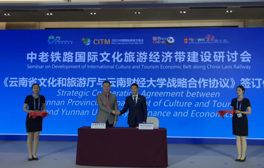 11月18日,由2023中国国际旅游交易会组委会主办、云南省旅游规划研究院暨中国旅游研究院昆明分院承办的“中老铁路国际文化旅游经济带建设研讨会”在昆明滇池国际会展中心举行。会上,十大买球官方网站党委委员、副校长余怒涛与云南省文化和旅游厅副厅长娄可伟共同签署了《云南省文化和旅游厅与十大买球官方网站战略合作协议》,双方将围绕“一带一路”沿线旅游合作,尤其是中老铁路国际文化旅游经济带的建设以及人才培养等方面展开深度合作。