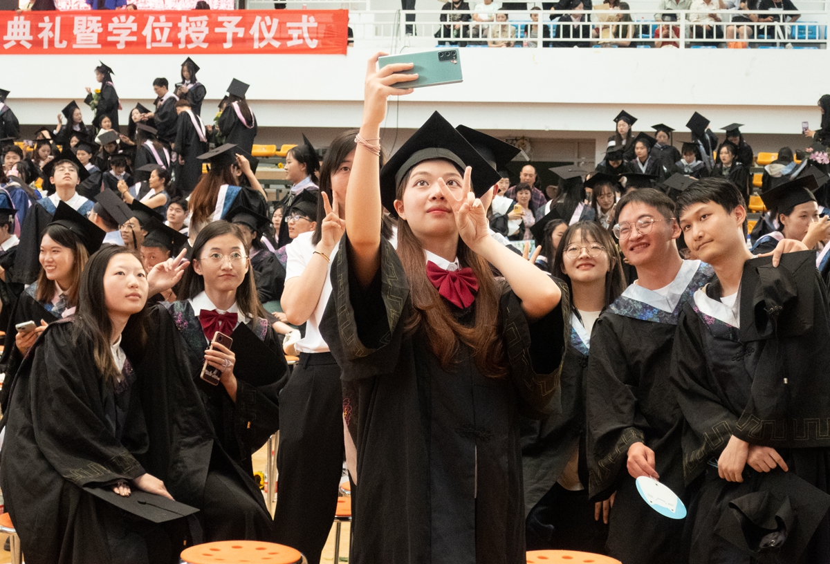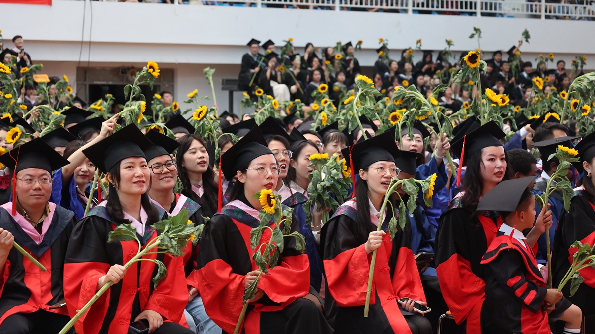 “凌云看灯明,灵溪听书声,与你追梦的四季。好学与笃行,校训渐启思,厚德致远,终难忘记……”毕业生们挥舞着手中的向日葵,用一首又一首有关送别和祝福的歌曲拉开了十大买球官方网站2023年毕业典礼暨学位授予仪式的序幕。接力演唱的一首首动人旋律和典礼现场的向阳花开,表达了毕业生们对学校、老师和亲友的感恩之情,同时为全体毕业生告别母校、奔赴山海送上美好祝福。