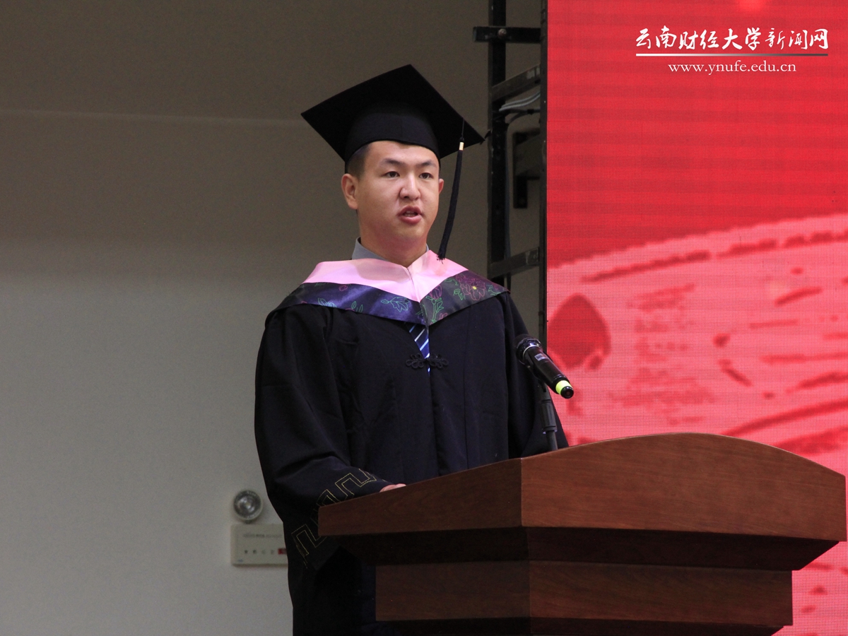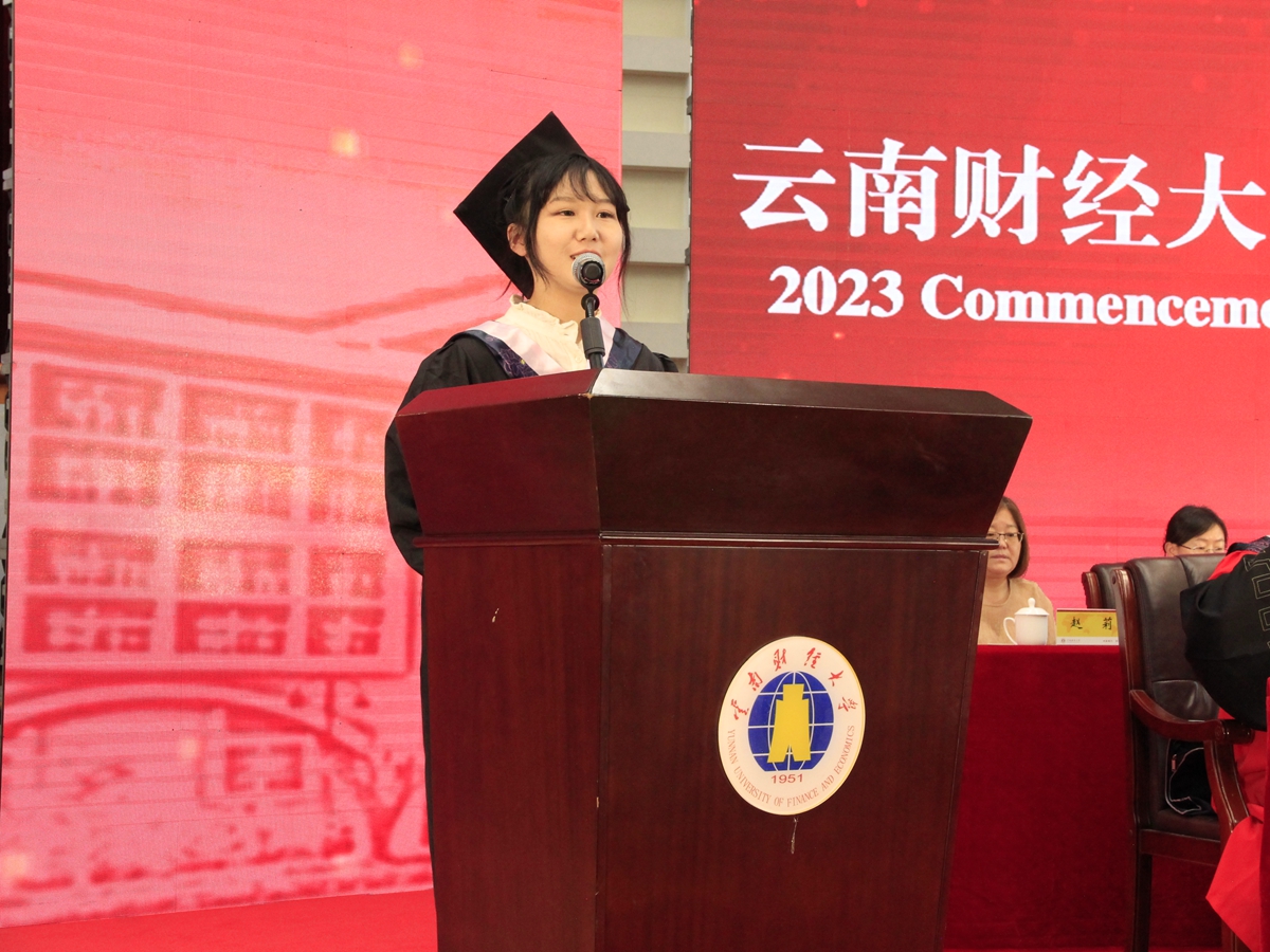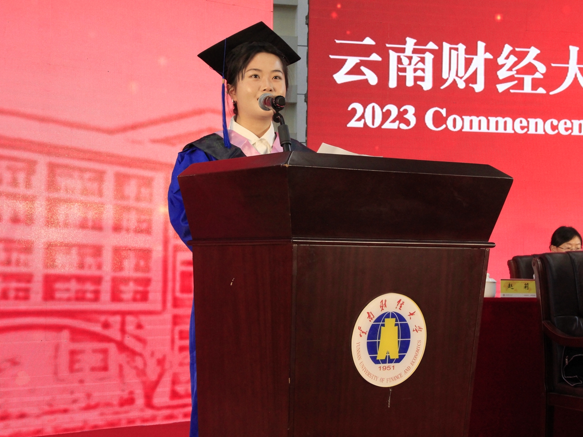 研究生代表,来自金融学院的肖涵予表示,在母校的悉心培养和老师的耐心教导下收获了知识、收获了成长,变成了更好的自己。“请母校和老师放心,我们将秉承‘好学笃行 厚德致远’之校训,坚守‘求实 创新’之校风,弘扬‘自强不息 敢为人先’之云财精神,用智慧和汗水奋力谱写中国式现代化青春篇章,在强国建设、民族复兴的新征程中,创造属于当代青年的辉煌!”
