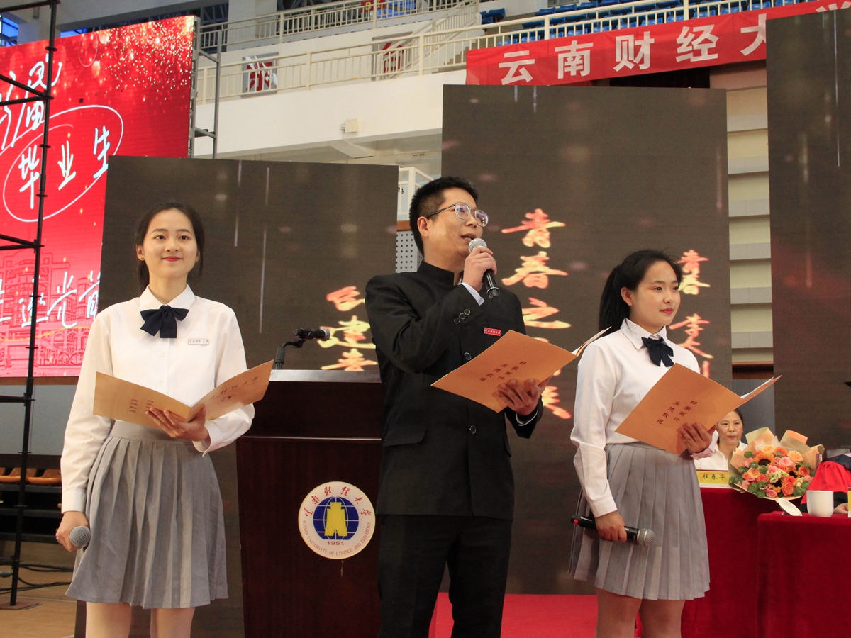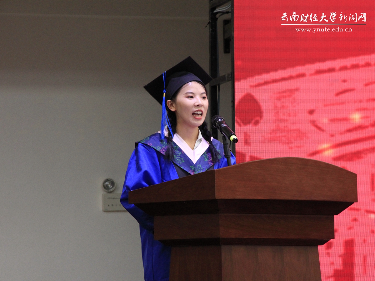 “以青春之我,创建青春之家庭,青春之国家,青春之民族,青春之人类,青春之地球,青春之宇宙,资以乐其无涯之生。”师生代表在典礼上朗诵了李大钊先生的散文《青春》节选,表达了毕业生们秉承云财校训、弘扬云财精神、立志民族复兴、勇担时代重任的青年心声。