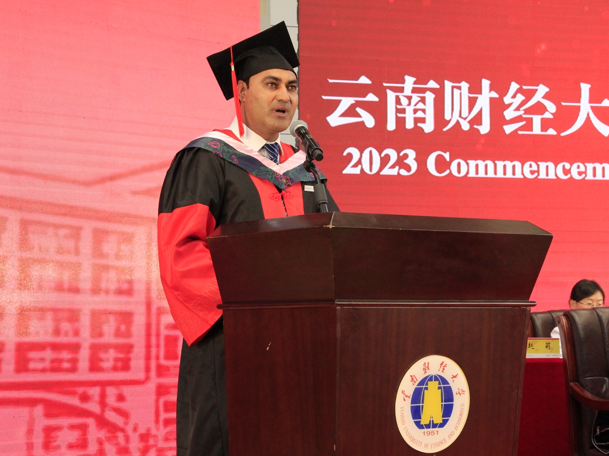 “关爱、情感和知识的传播没有界限,与人为善是我们人类共同的价值观。”国际学生代表阿拉沙德表达了对学校、老师及亲友的感谢,并代表国际学生承诺:为社会服务,支持人类的美好事业,为增进各国与中国的友谊和共同发展而努力。