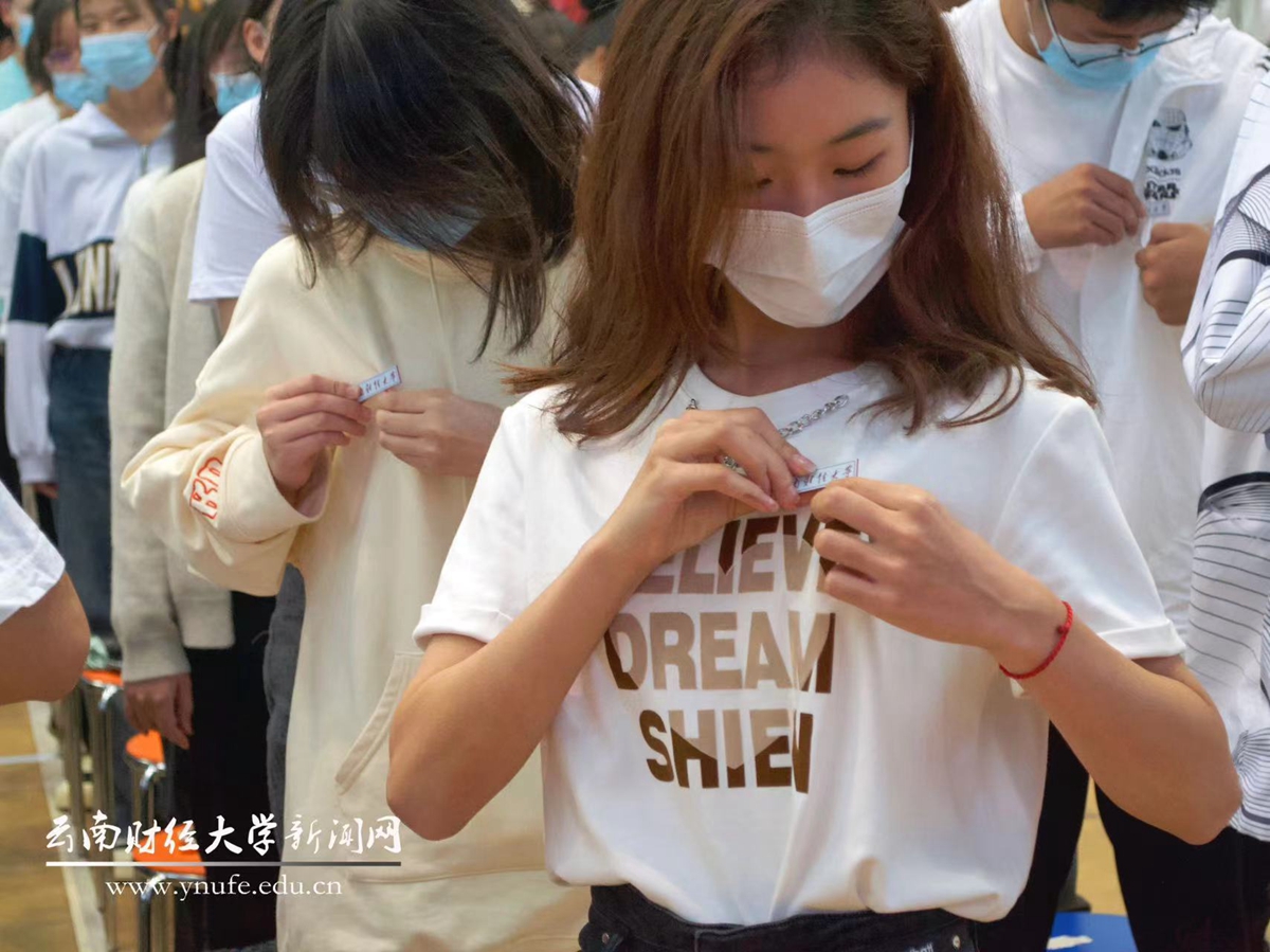 校领导、毕业生代表为新生代表佩戴校徽,参与线下典礼的新生在现场佩戴校徽。从这一刻开始,“云财人”将伴随每一位新生,成为一生的印记。