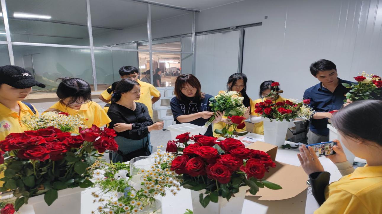 7月16日,商学院暑期“三下乡”调研二队赴晋宁区花卉企业开展乡村振兴调研活动,学院党委书记王敏带队。上午,调研团进入云天化全自动化光伏花卉智能温室大棚,见证了各种云南特色新品玫瑰的种植,同时了解到玫瑰压枝法的原理以及云南省高科技花卉基地“科研+种植+水肥+采后处理+品牌流通+销售”的花卉全产业链。下午,玉莲花卉合作社负责人周毅莲带领团队参观鲜切花加工厂,调研队就乡村振兴下合作社的发展进行访谈,深入了解晋宁花卉产业在乡村振兴推动下的发展状况,并在专业人员的指导下完成了各类花束的搭配、鲜花的保鲜、打包等工作。