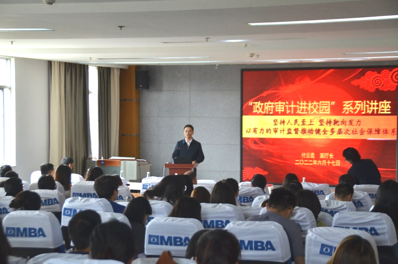 6月17日下午,云南省“政府审计进校园”系列讲座第三讲在买球逸夫楼410举行,云南省审计厅党组成员、副厅长付云昆以“坚持人民至上,坚持靶向发力,以有力的审计监督推动健全多层次社会保障体系”为主题开展专题讲座。买球党委委员、副校长王晓萍主持讲座,相关部门专业技术人员,会计学院审计专业学生及部分师生代表参加讲座。