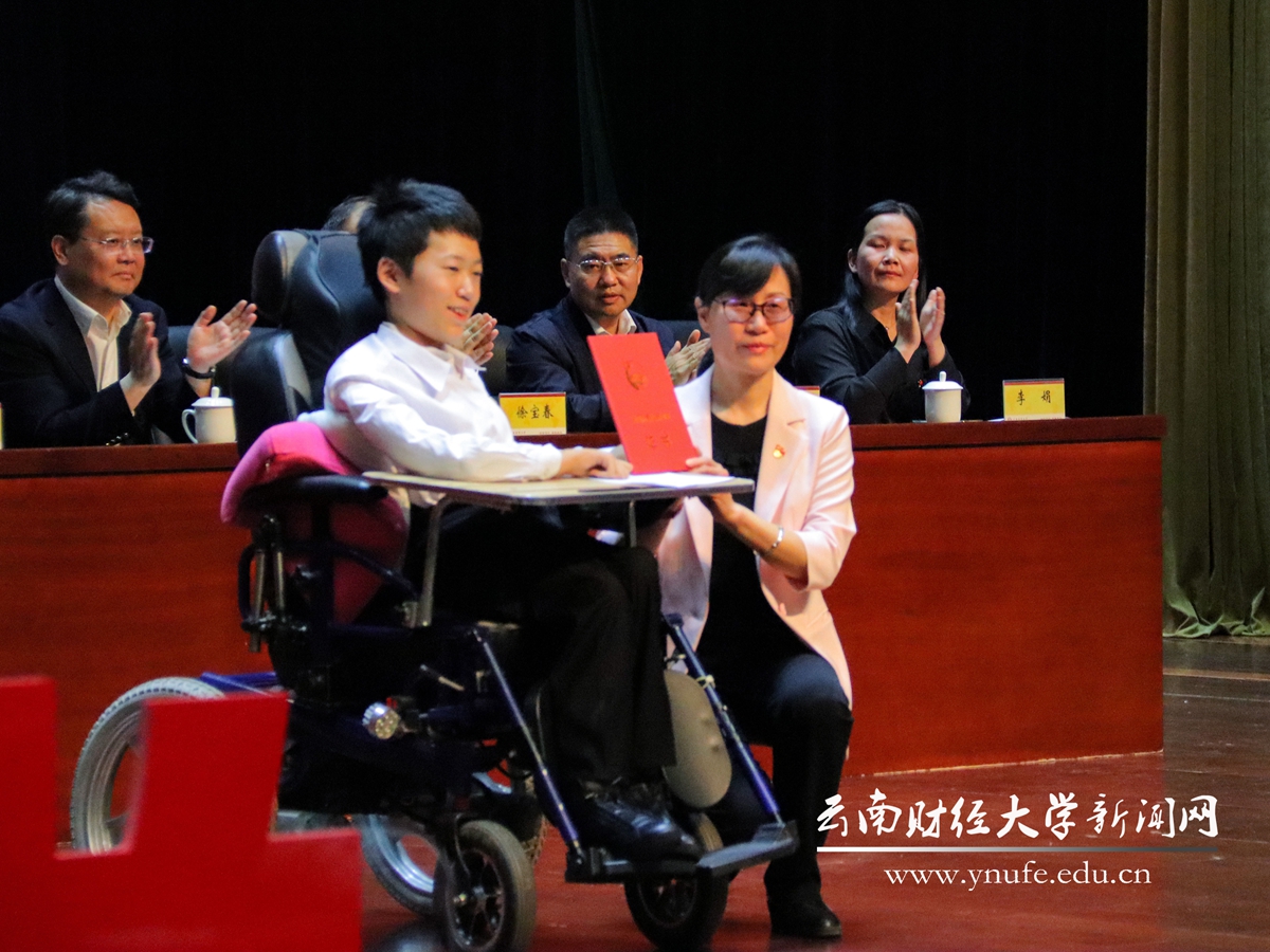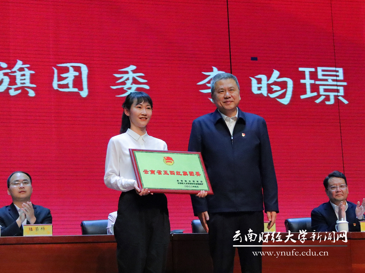 表彰环节,王建颖俯身为“全国优秀共青团员”肖云迪同学颁奖;王敏为云南省五四红旗团委获奖集体代表颁奖。肖云迪同学和优秀团干部代表、商学院刘煜老师作为获奖代表发言。