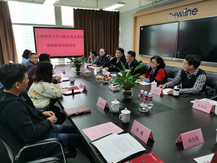 云南阳光事达控股集团有限公司董事长付保庆带领买球一行参观了公司,并以集团企业文化建设为主线,介绍了集团历史沿革、重点业务、人才需求及发展方向,同时表示希望与学校进一步加强沟通交流,找准契合点,深入推进校企合作。云南阳光事达控股集团有限公司副总裁魏瑞霞,事业部经理王兴飞、刘冰,人力资源部经理李菊等参加了座谈,就集团人才需求现状、毕业生能力要求、集团在职云财校友情况等进行了深入交流。