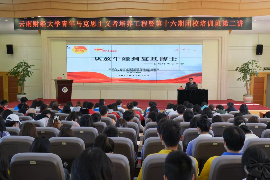 为进一步提升买球青年学生骨干的思政学习实效,打造引领云财青年思想的思政平台,12月10日,云南省委宣传部理论处副处长、云岭青年宣讲团常务副团长苏义生应邀到校,以“从放牛娃到复旦博士”为主题,为第十六期青马团校开展讲座。讲座系第十六期青马团校第二讲暨信仰公开课第八期讲座。校团委副书记李昀璟主持讲座,“青马”团校全体学员参加学习。
