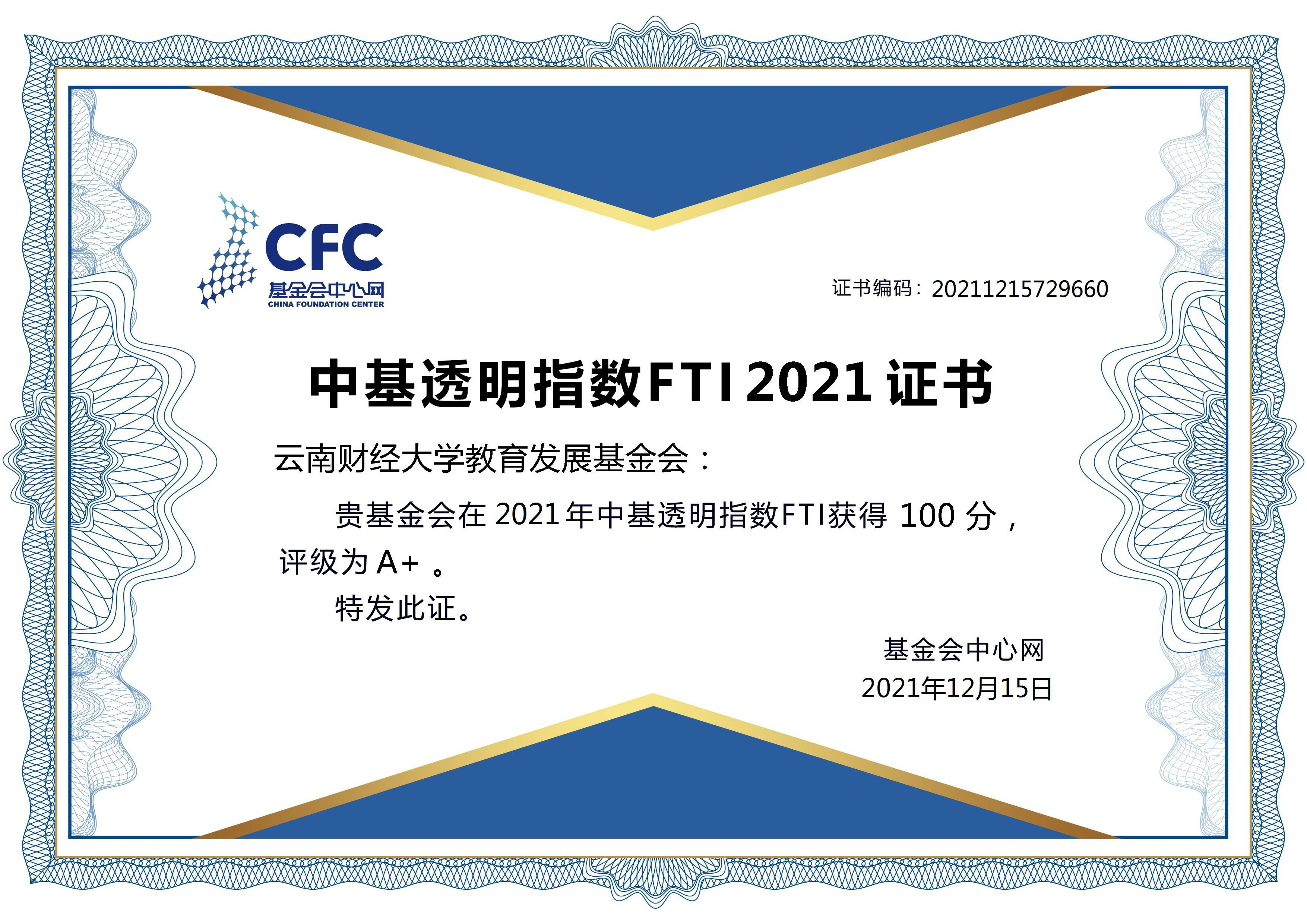 2021年12月15日,基金会中心网发布“中基透明指数 FTI2021 ”,十大买球官方网站教育发展基金会评分100分,再次获评“A+”级。