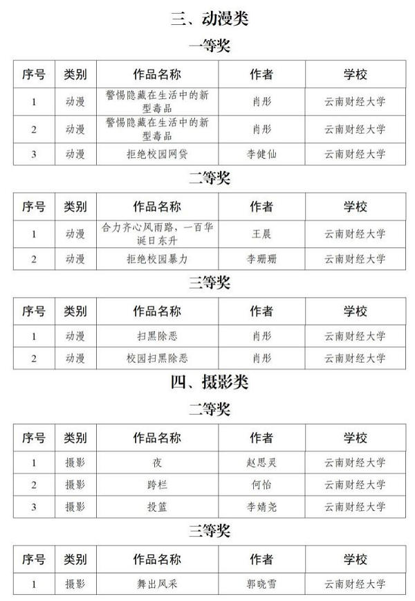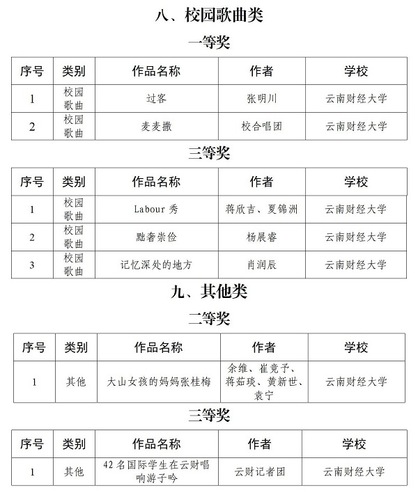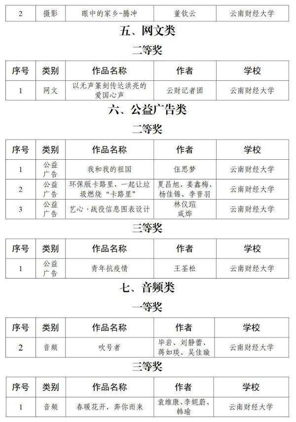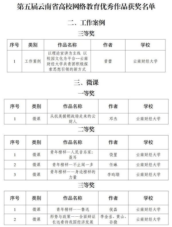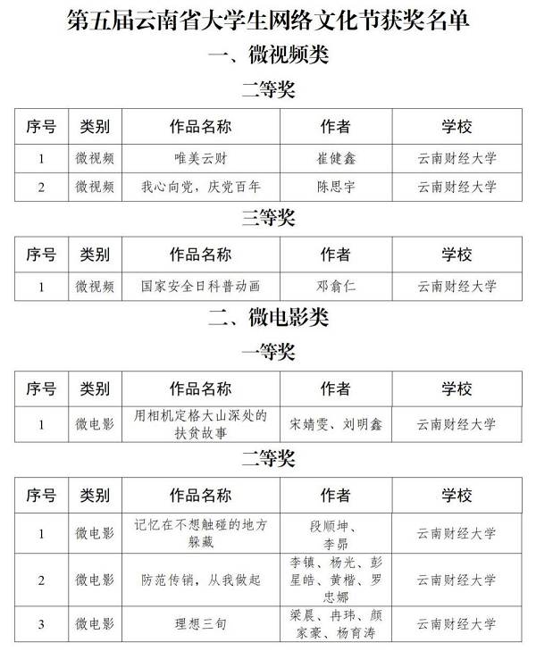 以下为第五届“全国大学生网络文化节”和“全国高校网络教育优秀作品推选展示活动”,以及第五届“云南省大学生网络文化节和高校网络教育优秀作品”获奖情况: