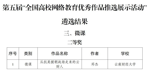 近日,由教育部思想政治工作司、中央网信办共同举办的“第五届全国大学生网络文化节和全国高校网络教育优秀作品推选展示”(简称“一节一推选”)活动结果出笼。在“全国高校网络教育优秀作品推选展示活动”遴选中,买球微课作品《从抗美援朝战场走来的云财人》获二等奖;在“全国大学生网络文化节”作品遴选中,买球动漫作品《警惕隐藏在生活中的新型毒品》获二等奖,微电影作品《用相机定格大山深处的扶贫故事》获优秀奖,校园歌曲作品《过客》、《麦麦撒》荣获优秀原创作品奖,《过客》同时获网络人气奖。