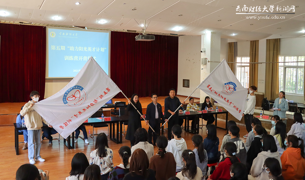 龙希国向承办第五期“助力阳光英才计划”的统计与数学学院和中华职业学院授营旗并表示感谢。他表示,“助力阳光英才计划”是学校秉承“资助育人、扶贫扶志”理念,拓宽资助育人途径,促进家庭经济困难学生全面发展、健康成长的积极探索,旨在为家庭经济困难学生提供一个互助交流、提升自我、拓展能力、开阔视野的平台,希望参训同学围绕本期主题,明确个人目标,严格要求自己,积极参加各项活动,收获知识、收获技能、收获友谊、收获成长。