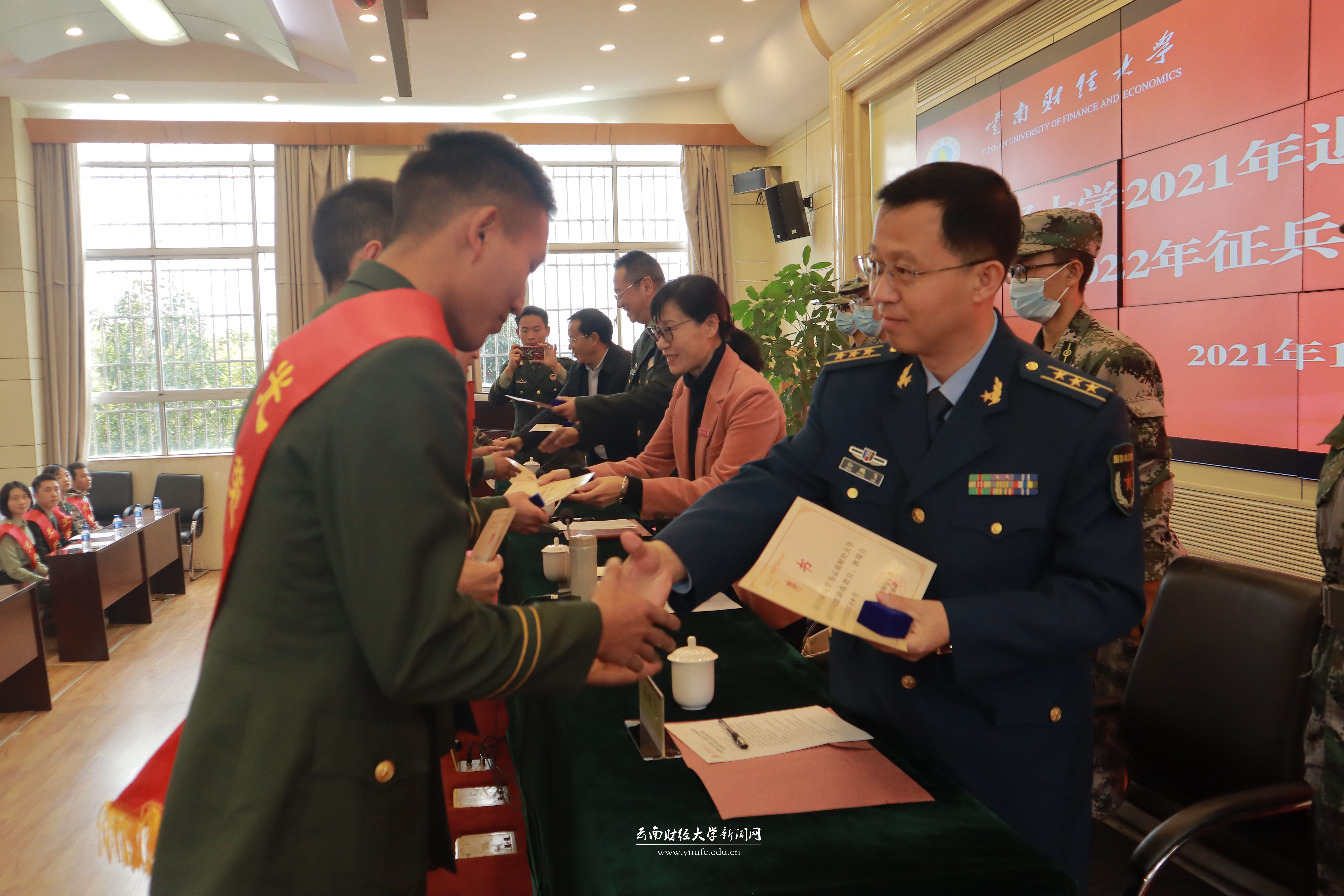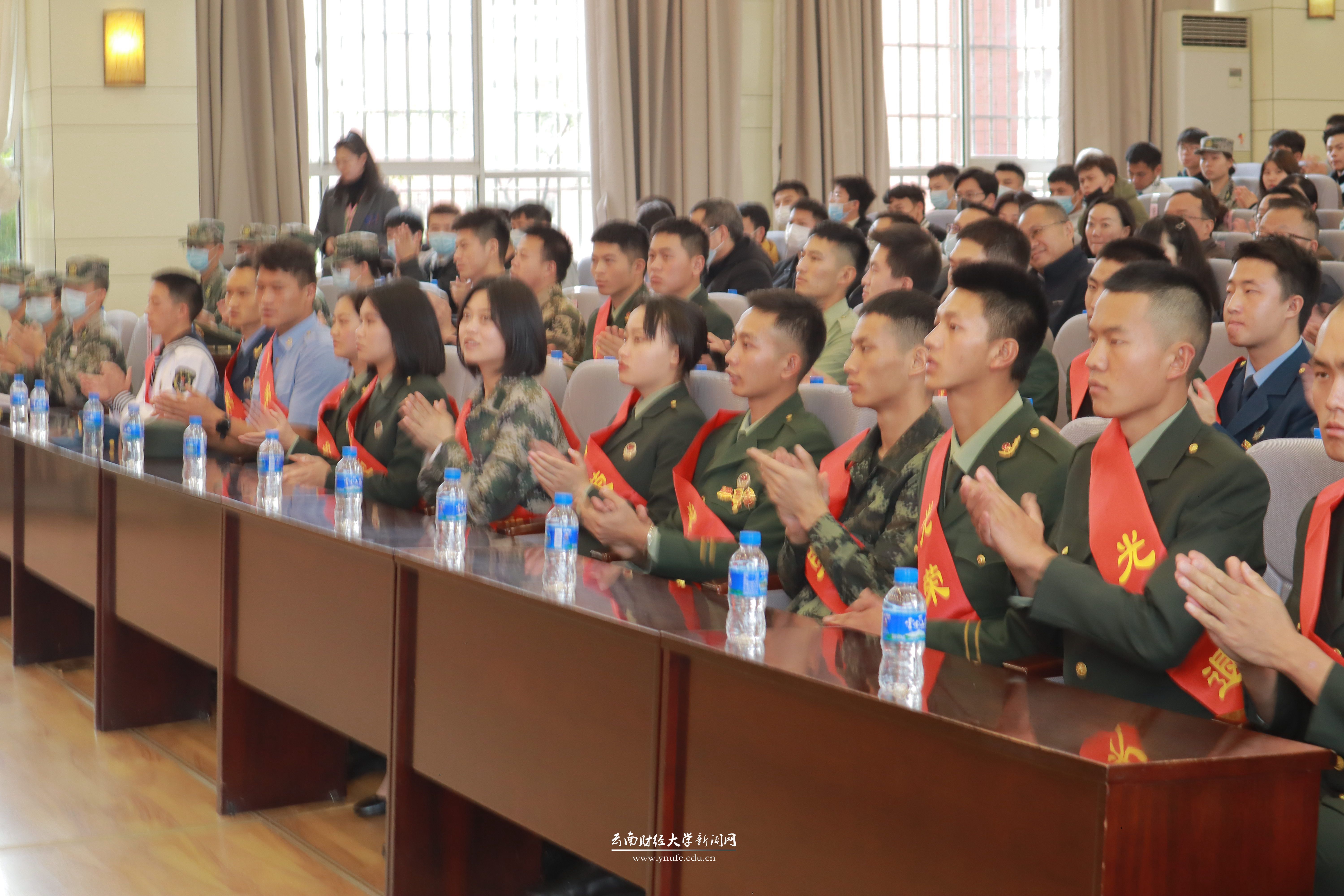 11月12日下午,十大买球官方网站2021年退伍大学生欢迎仪式暨2022年征兵入伍动员启动会在凌云楼国际学术报告厅举行。云南省政府征兵办副主任、云南省军区动员局副局长李宁明,云南省军区动员局参谋邓坤,五华区武装部部长任鹏飞,学校党委书记王建颖,学校办公室、宣传部、学生处(学工部、武装部)、教务处、校团委、招生与职业发展中心相关负责人,各学院党委书记、学生管理科科长,2021年退伍复学全体学生,各学院学生代表及学校国防后备连学生代表参加会议。会议由学校党委副书记桂正华主持。