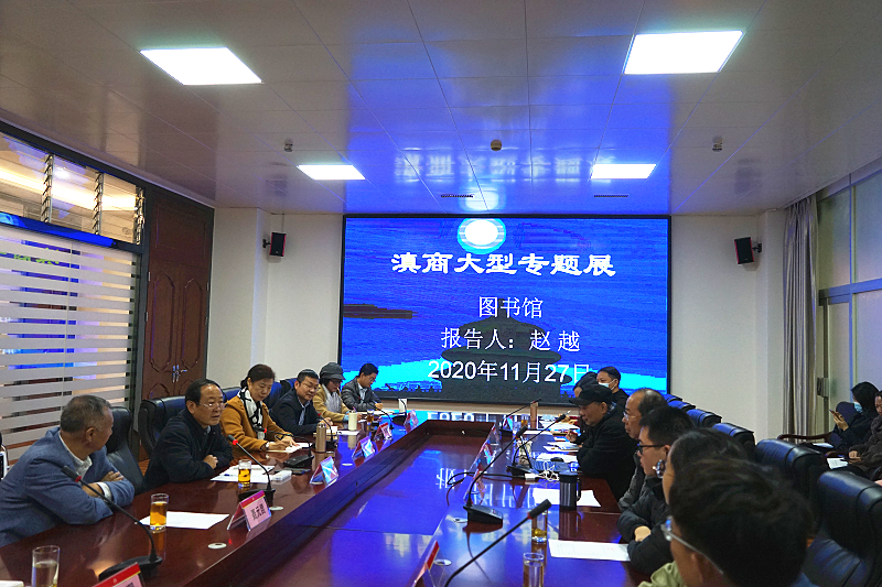 图书馆馆长赵越汇报了滇商大型专题展有关内容,从主体框架、版块设计、内容安排、预期成效等方面进行了说明。