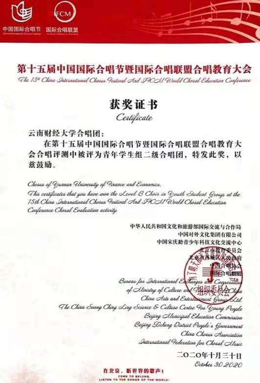 中国国际合唱节(China International Chorus Festival 简称CICF)创办于1992年,是经国务院批准,目前中国境内唯一的国际性、国家级合唱类艺术活动。中国国际合唱节是我国举办的规模最大、规格最高的国际合唱艺术盛会,是集境内外专业和业余合唱团体于一体的综合性合唱艺术活动。合唱节每两年举办一届,至今已成功举办十五届。据统计,本次直接参加中国国际合唱节的国内外合唱团体超过4000余支,总人数达80000余人,堪称今年全球合唱艺术活动的一次盛宴,代表了当今合唱比赛的最高艺术水平。 作为云南省唯一受邀参加的高校合唱团,买球合唱团的表现充分展示了买球艺术教育的成果和风采。