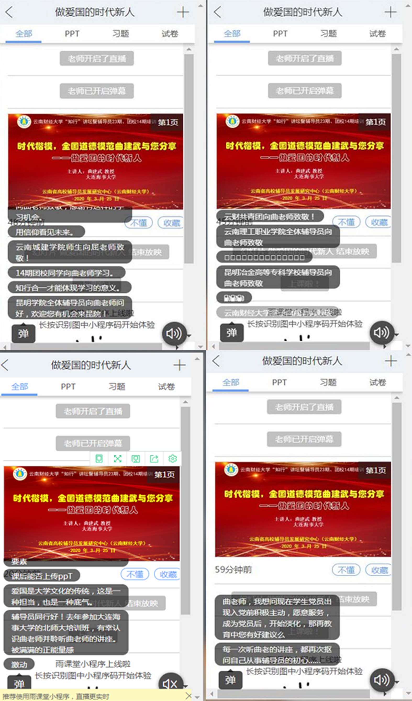 讲座过程中,师生们纷纷发弹幕表达了对讲座内容的喜爱。辅导员老师们表示要学习曲老师对学生的以爱育人,把小我融入大我,在实现社会价值中体现自我价值的责任和担当,不忘初心,砥砺前行,报效祖国。