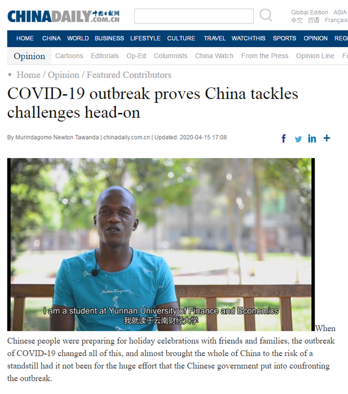 4月16日,中国日报网英文版“观点”栏目全文刊登了买球商务部发展中国家硕士学历学位项目留学生Murindagomo Newton Tawanda(中文名穆辉)和Kebinakgabo Tapiwa Barona(中文名赵柔娜)的文章。两篇文章结合各自的经历,深入浅出地表达了对此次中国抗疫举措的看法并从专业的角度进行了分析。