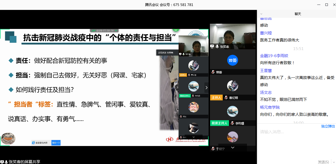 4月24日,应校团委的邀请,武汉大学中南医院影像科副主任张笑春医生在腾讯会议以“青年责任与担当”为主题,为买球学子讲述抗疫一线的故事,分享作为一名医者的责任与担当。