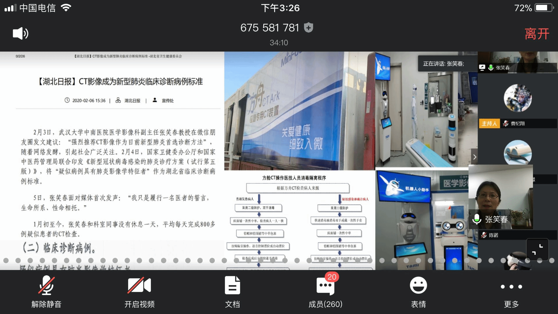 张笑春作为一名一线医生,亲历了非典、汶川地震等重大事件,有着丰富的突发事件处理的经验,在此次的抗击疫情过程中作出了突出贡献,先后被各大媒体争相报道。在交流中,她讲述了英雄背后的故事:面对新冠肺炎带来的重重压力,在抗疫初期,她选择了大胆直言小心求证,是最早提出CT影像联合核酸检测综合确诊方案的医生。春节前夕,她积极响应防疫工作需要,退掉了全家返回老家的车票,结果父母不幸在2月双双感染新冠病毒,在雷神山医院住院后才转危为安。她年幼的女儿在家自行隔离,4个月的时间不曾走出家门……在艰难的时刻,她一直驻守在医院,不能为家人分难解忧,而家人和她的共同坚守,充分体现了此次抗击疫情中全中国人民“舍小家,顾大家,爱国家”的个人担当;她参与研判疫情的真实数据、为制定决策提供专业意见、促进疫情防控的具体措施落地等专业行为,体现了“医者用行动做世界、国家和社会需要的事”的责任与担当。
