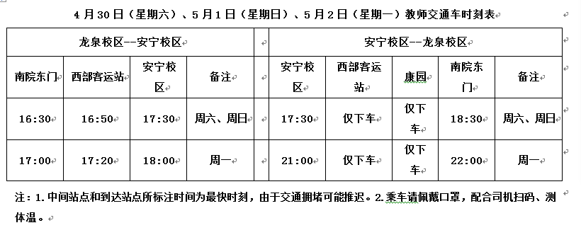 根据学校安排,4月30日(周六)、5月1日(周日)、5月2日(周一)放假3天,安宁校区交通车时刻表安排如下: