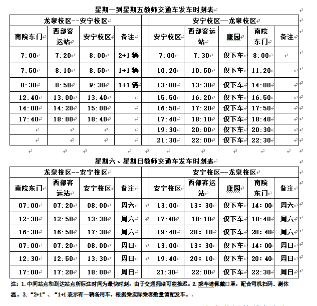 根据学校安宁校区第6-12周周末双学位上课安排,从2022年10月15日开始调整安宁校区教师交通车周末车次,请各位老师乘车时持24小时核酸阴性报告并全程佩戴口罩做好个人防护。交通车发车时刻表如下: