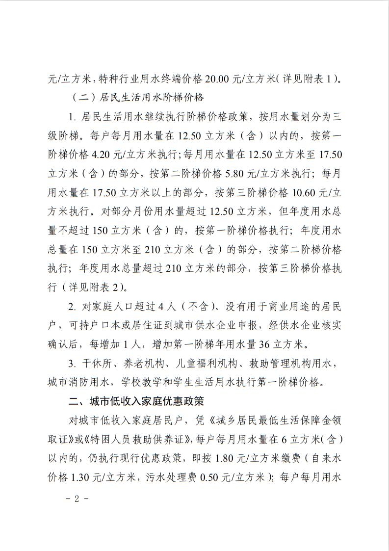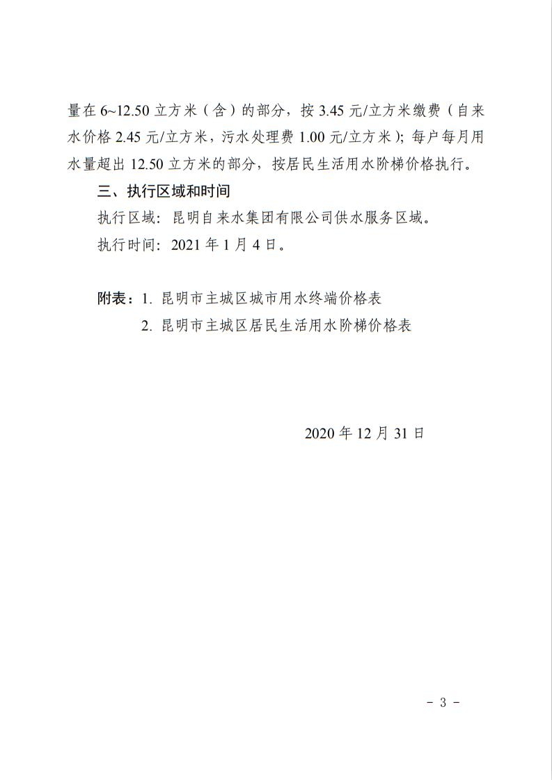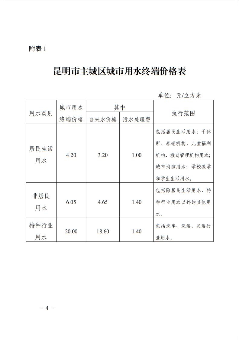 根据《昆明市发展和改革委员会关于调整主城区供水价格的通知》(昆发改价格[2020]836号)文件精神,昆明主城区居民生活用水终端价格由3.45元/立方米调整为4.20元/立方米,非居民用水终端价格由5.63元/立方米调整为6.05元/立方米,特种行业用水终端价格由15.50元/立方米调整为20.00元/立方米,自2021年1月4日起执行。自2021年1月4日起,学校将按调整后的供水价格执行收费标准。