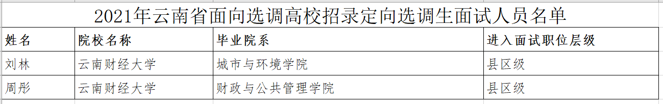 云南省面向选定高校招录2021年定向选调生笔试工作已顺利完成,按照中共云南省委组织部办公室“关于协助发布云南省面向选定高校招录2021年定向选调生进入面试人员名单的函”,现将十大买球官方网站进入面试人员名单公布如下: